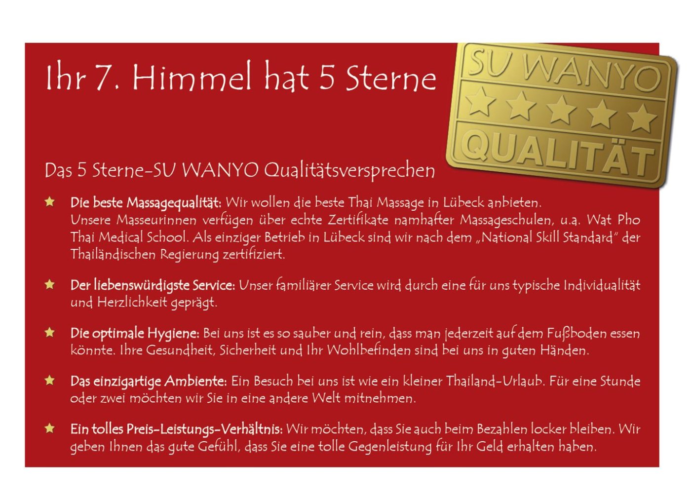 Als erste und einzige Thai Massage im echten Norden erfüllt SU WANYO den „National Skill Standard" der Thailändischen Regierung. Dieses wertvolle Qualitätssiegel wurde am 8. Juli 2014 in einer feierlichen Zeremonie in Hannover von einem hohen Repräsentanten der Thailändischen Regierung an insgesamt sieben Thai Massage Betriebe in Deutschland (Arnsberg, Bochum, Braunschweig, Lübeck, Mönchengladbach, Rheine, Vechelde) vergeben. Ein Prüfungsteam aus Thailand hat in den letzten Wochen die Städte bereist und in den Betrieben eine Inspektion durchgeführt. Außerdem mussten mindestens fünf in den Betrieben beschäftigte Therapeutinnen in einem speziellen 150-stündigen Programm trainiert werden und eine theoretische und praktische Prüfung ablegen. Alle sechs Mitarbeiterinnen von SU WANYO haben mit sehr guten Ergebnissen bestanden.