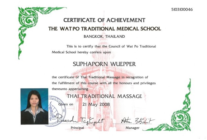 Im Jahr 2008 habe ich, nachdem ich zuvor rund fünf Jahre als Masseurin praktisch gearbeitet habe, zahlreiche Prüfungen in Wat Po (WAT PO Thai Traditional Medical School, Bangkok) abgelegt und Diplome erworben. Auch wenn mir bewusst ist, dass meine Ausbildung noch nicht abgeschlossen ist, es vielleicht nie sein wird, will ich mein Wissen und Können in den Dienst anderer Menschen stellen.